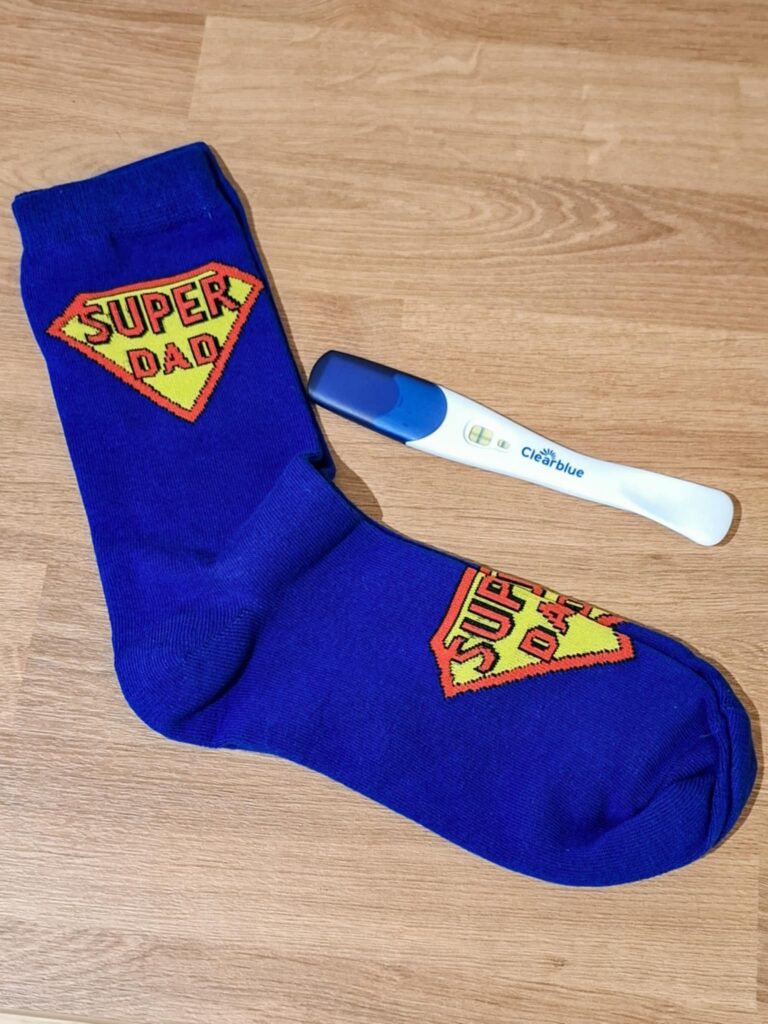 Ergens had ik natuurlijk zelf al een voorgevoel gehad op dag 33, dus samen met de zwangerschapstest bestelde ik sokken met daarop het logo van Superman en daaronder de tekst ‘Superdad’. Ik pakte ze in, stak de test weg en in afwachting van zijn thuiskomst, vertelde ik aan ons eerste hondje dat ik zwanger was. Ik wilde dat toch al met iemand gedeeld hebben.